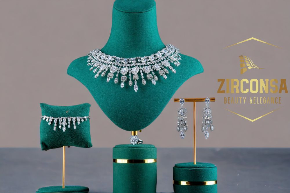 طقم اكسسوارات نسائي مرصع بحجر الزركون عالي الجودة مشابه لمظهر الألماس .